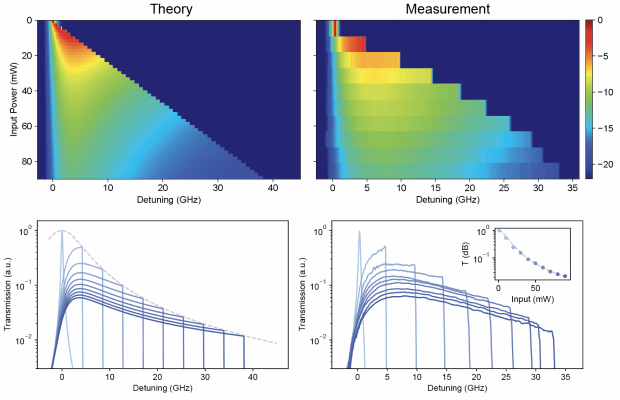 圖1:工作原理。a、集成非線性光學(xué)隔離器的工作原理示意圖。圖顯示傳輸(T)與頻率(ω)。b,隔離器與驅(qū)動(dòng)它的激光直接耦合的示意圖,僅存在激光(紅色),僅存在不必要的后向傳輸(藍(lán)色)和具有后向傳輸?shù)募す?。?dāng)激光打開時(shí),后向傳輸不再共振,激光被隔離。c,氮化硅器件的圖像。比例尺,100 μm。d,理論(虛線)和實(shí)驗(yàn)(藍(lán)色數(shù)據(jù)點(diǎn))在不同輸入泵功率和最大泵失諧時(shí)的反向傳輸,說明了洛倫茲傳輸形狀。