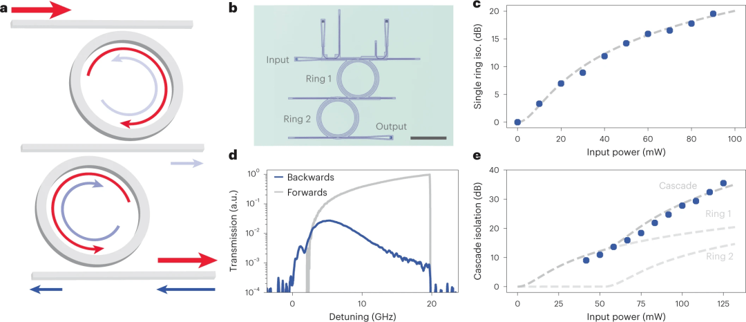 圖4:隔離級(jí)聯(lián)。a,級(jí)聯(lián)隔離環(huán)示意圖。b,制造的級(jí)聯(lián)隔離環(huán)的光學(xué)顯微照片。比例尺,200 μm。c,理論(虛線)和實(shí)驗(yàn)(藍(lán)色數(shù)據(jù)點(diǎn))功率相關(guān)的單環(huán)隔離。d、級(jí)聯(lián)隔離環(huán)與110mw泵正向和反向傳輸。e,理論(虛線)和實(shí)驗(yàn)(藍(lán)色數(shù)據(jù)點(diǎn))級(jí)聯(lián)環(huán)的功率依賴隔離。理論擬合是通過將單個(gè)環(huán)的隔離比乘以從第一個(gè)環(huán)紅移的第二個(gè)環(huán)來計(jì)算的。測(cè)量從40mw開始,因?yàn)樾枰@么多的泵浦功率來重疊兩個(gè)環(huán)共振。