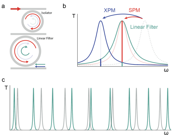 我們可以用同樣的原理來構(gòu)造一個(gè)隔離器。圖1a所示的設(shè)置。一個(gè)強(qiáng)泵浦(紅色)被發(fā)送通過環(huán)形諧振腔與簡并順時(shí)針和逆時(shí)針共振。該泵加熱環(huán),導(dǎo)致折射率的熱光倒數(shù)增加和相應(yīng)的共振頻率下降。此外,環(huán)中的高功率導(dǎo)致順時(shí)針模式的SPM和逆時(shí)針模式的XPM。這使得逆時(shí)針模式的共振位移是順時(shí)針泵浦模式的兩倍。現(xiàn)在的分裂共振允許在泵浦方向上的近乎統(tǒng)一的傳輸,但實(shí)質(zhì)上減少了在相反方向上的相同頻率的傳輸(藍(lán)色)。