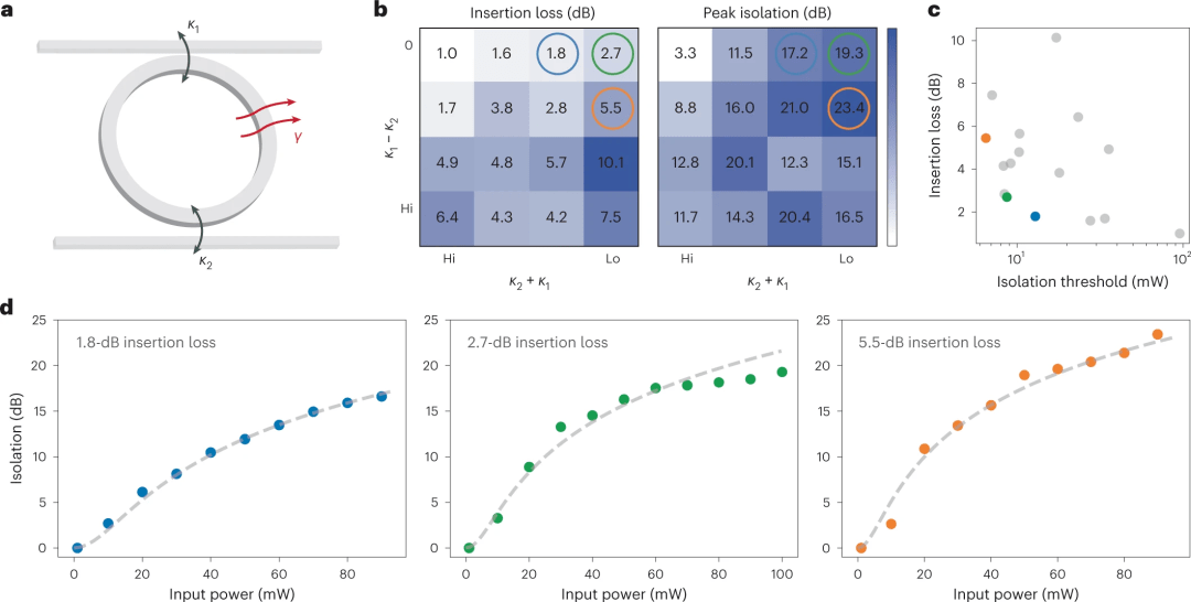 圖3:性能優(yōu)化。a,隔離器環(huán)示意圖,說明關(guān)鍵參數(shù):κ1, κ2和γ -輸入耦合率,輸出耦合率和固有損耗率。b,熱圖顯示不同偶聯(lián)率下的插入損失和峰值隔離。色條限制由每個(gè)圖的最小值和最大值設(shè)定(白色:1.0 db插入損耗,3.3 db峰值隔離;深藍(lán)色:10.1 db插入損耗,23.4 db峰值隔離)。表現(xiàn)良好的參數(shù)用藍(lán)色、綠色和橙色圓圈突出顯示。c, b的隔離和插入損失的相關(guān)性d,三個(gè)突出顯示環(huán)的泵功率依賴隔離。