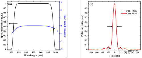 圖1.數(shù)值模擬的100PW激光放大光譜和基于非匹配光柵壓縮器的輸出脈沖。