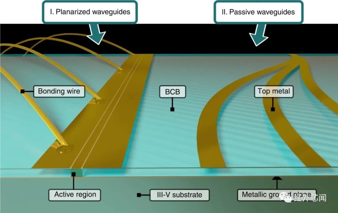 但在該團隊設計的集成光學平臺中,這些問題都已經被解決。他們將接合線放置在無源、苯并環(huán)丁烯覆蓋區(qū)域上方的金屬頂部,有效避免了在有源區(qū)頂部形成任何缺陷,并且能夠制造非常窄的波導,遠低于接合線尺寸。窄波導寬度可以用作基本橫向激光模式的有效選擇機制,并且也有利于散熱和高溫連續(xù)波操作。