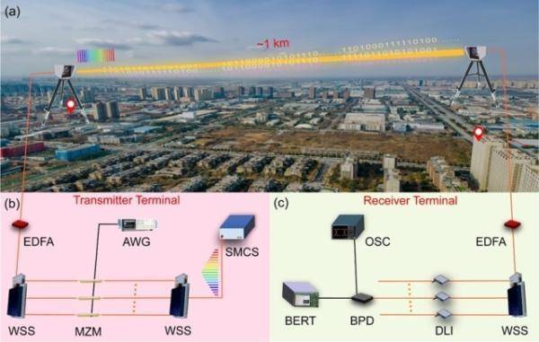 建立大容量、長(zhǎng)傳輸距離FSOC系統(tǒng)是當(dāng)下領(lǐng)域內(nèi)的研究熱點(diǎn)。片上微腔孤子光頻梳(SMC)具有超高重復(fù)頻率,且各個(gè)梳齒具有嚴(yán)格相等的頻率間隔,是波分復(fù)用FSOC系統(tǒng)的理想激光光源。西安光機(jī)所研究員謝小平與光子網(wǎng)絡(luò)技術(shù)研究室研究員汪偉團(tuán)隊(duì)、瞬態(tài)光學(xué)與光子技術(shù)國(guó)家重點(diǎn)實(shí)驗(yàn)室研究員張文富和副研究員王偉強(qiáng)團(tuán)隊(duì)合作,利用新興的微腔孤子光頻梳代替?zhèn)鹘y(tǒng)的半導(dǎo)體可調(diào)諧激光陣列作為多載波光源,使用10 Gbit/s差分相移鍵控調(diào)制信號(hào),在相距1 km的自由空間光通信鏈路上實(shí)現(xiàn)了總速率為1.02 Tbps的并行數(shù)據(jù)傳輸。該工作將片上微腔孤子光頻梳作為多波長(zhǎng)光源應(yīng)用于自由空間光通信研究,對(duì)提升自由空間光通信的容量和解決自由空間光通信的體積重量和功耗(SWaP)問(wèn)題具有重要意義,并為未來(lái)大容量、長(zhǎng)距離自由空間光通信發(fā)展提供了新途徑。