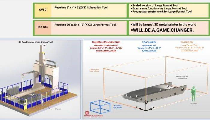 美國軍方對增材制造的好處深信不疑,在2021年他們已經(jīng)宣布將建造世界上最大的金屬 3D 打印機。美國 DEVCOM 陸軍地面車輛系統(tǒng)中心正在 ASTRO America、Ingersoll Machine Tool、西門子和位于 Rock Island Arsenal 的 MELD Manufacturing聯(lián)合制造和技術中心的幫助下制造這款巨型打印機。這臺打印機將成為無接縫車體項目的一部分,最終任務是為戰(zhàn)車打印一體式車體。據(jù)悉,項目預計需要大約 14 個月的時間,最終打印機將能夠打印30英尺長、20英尺寬、12英尺高(約9米×6米×3.6米)的金屬部件。雖然我們最近沒有這方面的消息,但該項目很可能會在不久的將來完成。