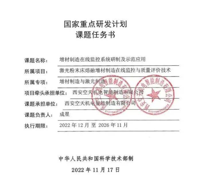 近期,2022年國家重點研發(fā)計劃項目評審結(jié)果公布,由西安空天機電智能制造有限公司(以下簡稱“西空智造”)牽頭申報的國家重點研發(fā)計劃“增材制造與激光制造”重點專項“激光粉末床熔融增材制造在線監(jiān)控與質(zhì)量評價技術(shù)”項目獲批立項。