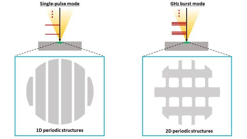 Giannuzzi等人用GHz脈沖模式在不銹鋼上演示了LIPSS的形成,顯示出與單脈沖模式相似的LIPSS的形成。 本文利用GHz飛秒激光脈沖在硅上形成LIPSS,通過與單脈沖模式相比,展示了GHz形成獨(dú)特納米結(jié)構(gòu)的能力,并討論了可能的形成機(jī)制。