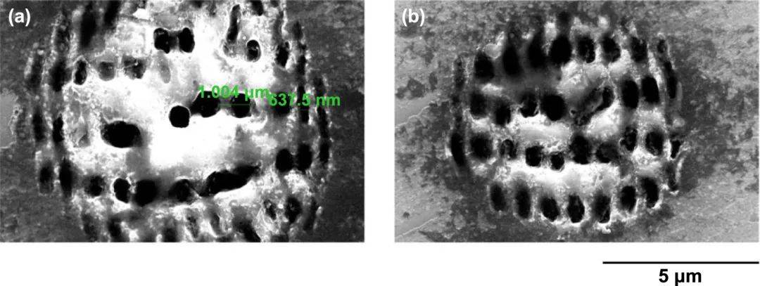 圖5顯示了一維LIPSS中納米溝槽電場(chǎng)增強(qiáng)的模擬結(jié)果。很明顯,增強(qiáng)并不是沿著納米溝槽恒定的(圖5(a))。周期性地獲得最高的電場(chǎng),產(chǎn)生電場(chǎng)增強(qiáng)5倍以上的熱點(diǎn)。從圖5(b)可以看出,納米槽側(cè)壁頂部的電場(chǎng)最大,底部的電場(chǎng)也得到了較強(qiáng)的增強(qiáng)。因此,研究人員認(rèn)為消融發(fā)生在納米槽的頂部和底部,從而產(chǎn)生了二維LIPSS。