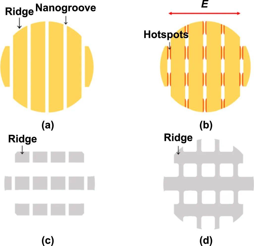 研究人員推測(cè),二維LIPSS的形成歸因于局部表面等離子體共振(LSPR)在一維LIPSS的納米溝槽中產(chǎn)生的“熱點(diǎn)”。當(dāng)光束照射在金、銀等金屬的一維LIPSS上時(shí),由于LSPR的作用,在一維LIPSS的納米溝槽中產(chǎn)生了電場(chǎng)高度增強(qiáng)的熱點(diǎn)。當(dāng)偏振方向垂直于一維LIPSS方向的光入射時(shí),增強(qiáng)效果最大。如圖3(b)所示。在一維LIPSS中,納米槽的側(cè)壁周期性地產(chǎn)生熱點(diǎn),并周期性地?zé)g側(cè)壁以生成二維LIPSS,如圖3(c)所示。