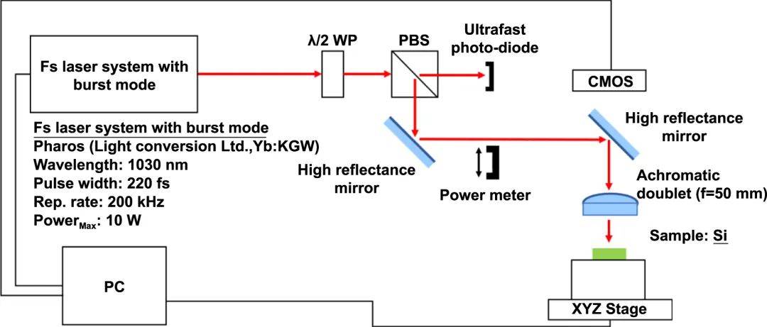 圖1:使用GHz飛秒激光脈沖形成LIPSS的實(shí)驗(yàn)裝置示意圖。