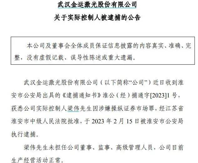 金運(yùn)激光16日晚間公告披露,近日收到淮安市公安局出具的《逮捕通知書》淮公(經(jīng))捕通字[2023]1號(hào),獲悉公司實(shí)際控制人梁偉先生因涉嫌操縱證券市場(chǎng)罪,經(jīng)江蘇省淮安市中級(jí)人民法院批準(zhǔn),于2023年2月15日被淮安市公安局執(zhí)行逮捕。