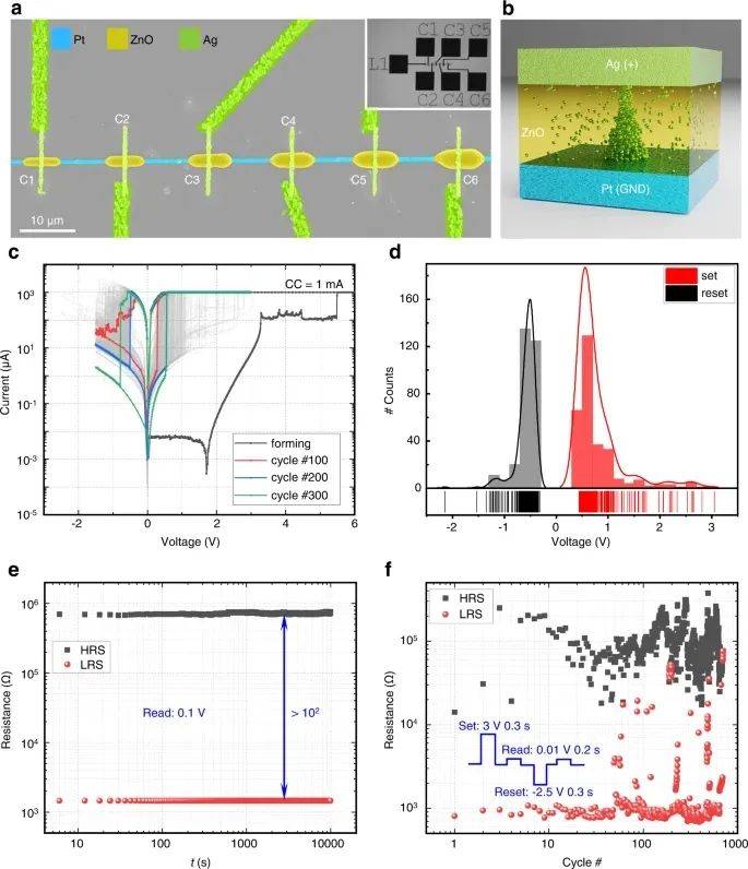 圖4a顯示了一個集成的1×6交叉memristor陣列,ZnO線寬從1.5μm (C1)增加到1.8μm (C2), 2.2μm (C3), 2.6μm (C4), 3.0μm (C5),到3.5μm (C6),線寬為0.6μm的單根Pt線上連接到激光打印接觸墊L1。6根ZnO棒材沿Pt線等距打印,間距為15 μm,并通過線寬為~0.72 μm的銀線層連接到接觸墊上(見圖4a所示整體結(jié)構(gòu))。