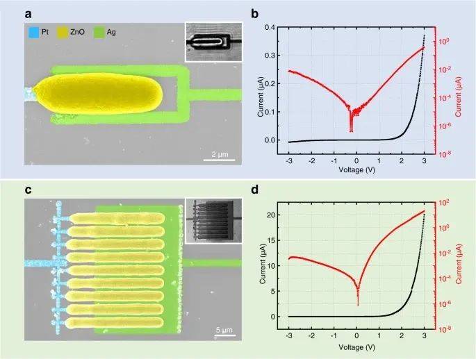 作為激光打印金屬和半導(dǎo)體的新研發(fā),研究人員考慮了橫向配置的Pt-ZnO-Ag二極管。如圖3所示,二極管由一根鉑線(~0.8 μ m寬)、一根銀線(~0.8 μ m寬)和中間的氧化鋅棒組成。通道長度,即Pt和Ag之間的橫向間距為~0.7 μ m。它是由ZnO棒的橫向?qū)挾葲Q定的。測量得到的電流-電壓特性如圖3b所示。