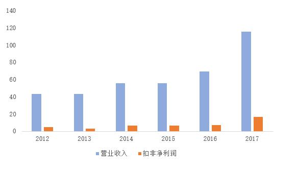 圖 2:2012-2017 年大族激光營收情況(億元),資料來源:大族激光歷年年報(bào)