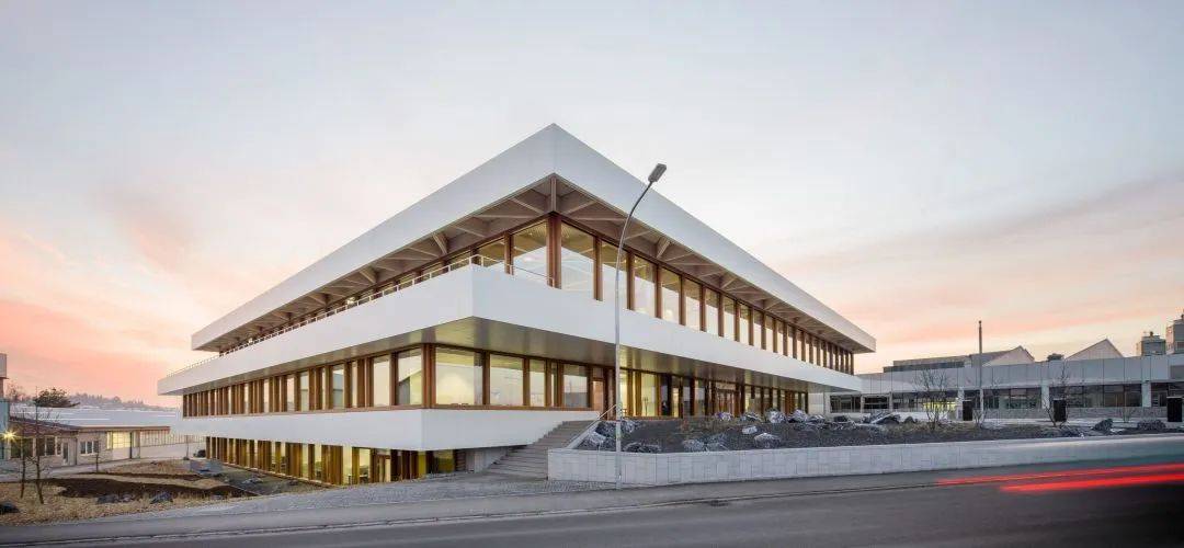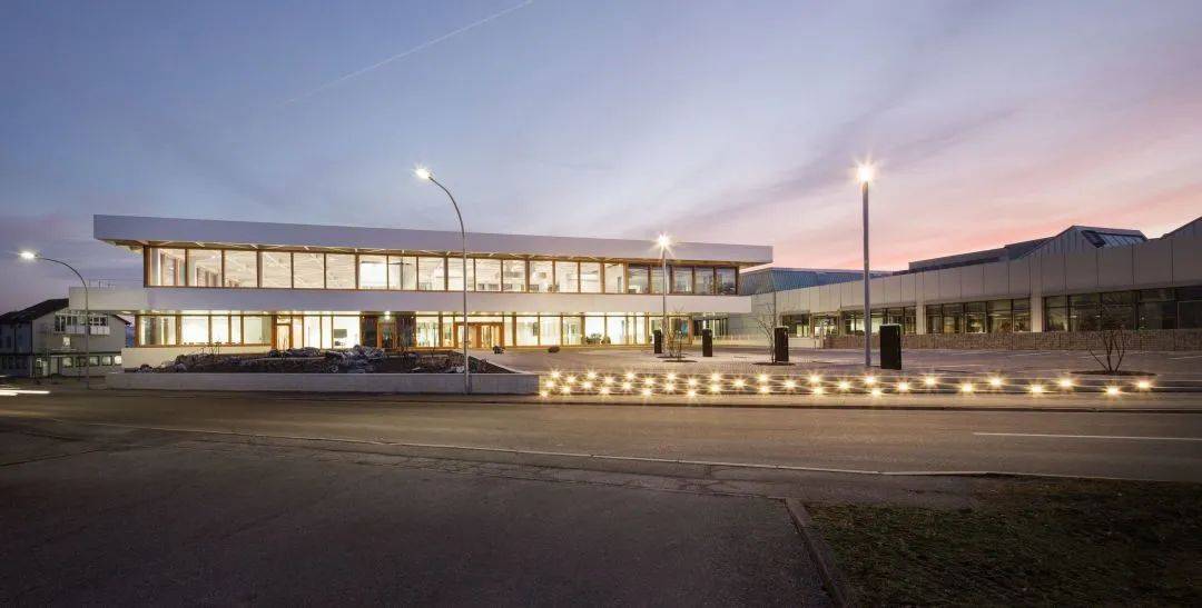 多功能建筑高約1.6 米,且立面由木玻璃結(jié)構(gòu)和水平鋼帶組成,由于樓板彼此偏移,視野在懸臂、護(hù)墻帶和寬敞的露臺(tái)區(qū)域之間營(yíng)造了景觀效果。