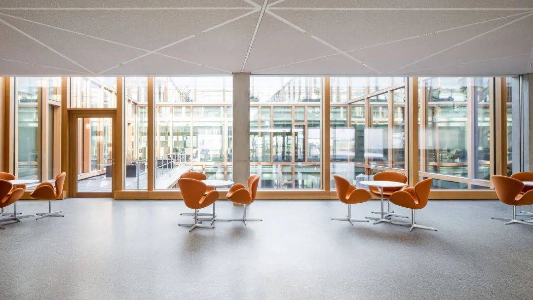 德國(guó)知名建筑設(shè)計(jì)事務(wù)所 Barkow Leibinger 公司設(shè)計(jì)了這座新建筑?!安蛷d作為公司的亮點(diǎn),高覽壯闊的建筑空間聳立在施蘭貝格中,使餐廳與戶外景觀保持一致,并在令人振奮的木制屋頂下提供寧?kù)o的音響效果。我們很高興能夠建造出通快員工理想中的建筑?!?建筑師 Regine Leibinger 說(shuō)。該建筑矗立在60 x 60 米的區(qū)域中,并圍繞內(nèi)部庭院形成一個(gè)環(huán)形,這使得所有房間都有自然采光,且該餐廳足夠容納420位員工同時(shí)用餐。建筑共四層樓,地上三層,地下一層,在頂層,采用開(kāi)放式木梁結(jié)構(gòu)與三角基本結(jié)構(gòu)建筑風(fēng)格。