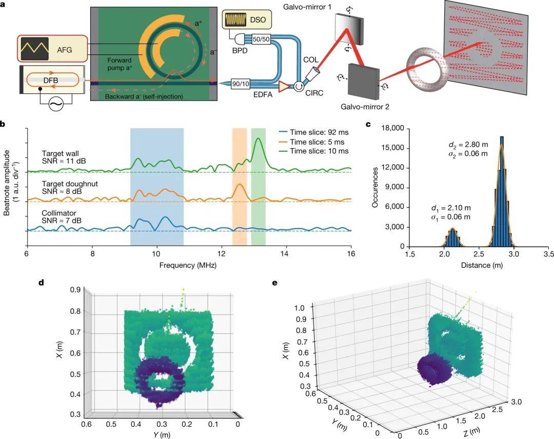 這種方法產生了一種具有低頻噪聲(衡量激光頻率穩(wěn)定性的指標)的激光,同時具有快速的波長調諧——這兩種特性都是用于光探測和測距(激光雷達)應用的激光器的優(yōu)良品質。然后研究人員進行了光學測距實驗,用激光高精度地測量距離。