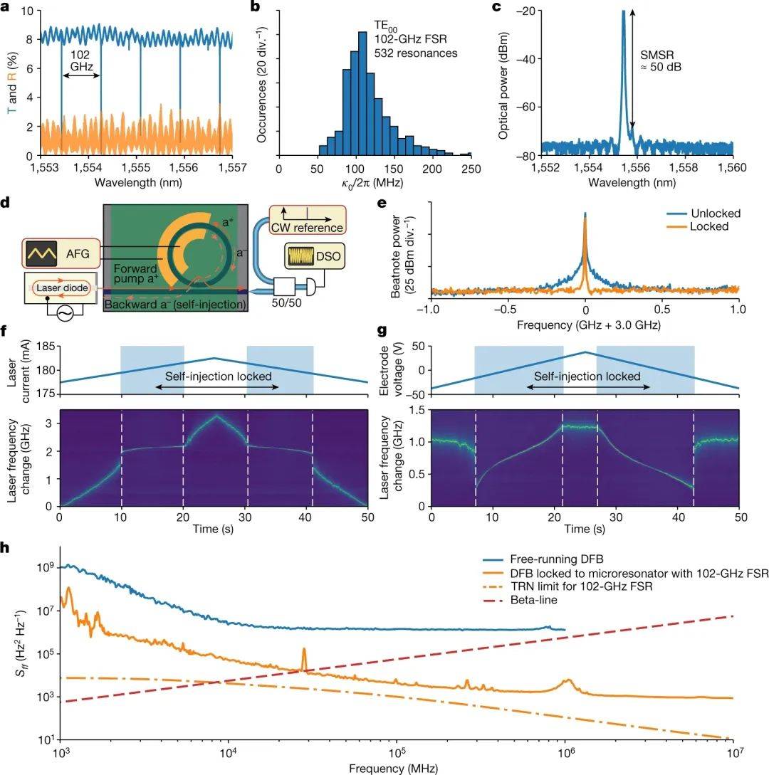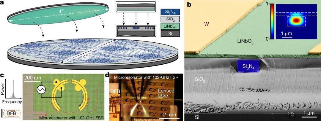 研究人員的平臺基于超低損耗Si3N4光子集成電路與薄膜LiNbO3的異質集成,通過在晶片級直接鍵合,與之前演示的芯片級集成相比,具有8.5分貝/米的低傳播損耗,通過自注入鎖定激光二極管實現窄線寬激光。