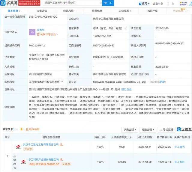 近日,綿陽華工激光科技有限公司成立,法定代表人為鄧家科,注冊資本1000萬元人民幣,經(jīng)營范圍包含:增材制造裝備制造;金屬基復(fù)合材料和陶瓷基復(fù)合材料銷售;新材料技術(shù)研發(fā);3D打印服務(wù)等。企查查股權(quán)穿透顯示,該公司由華工科技間接全資控股。