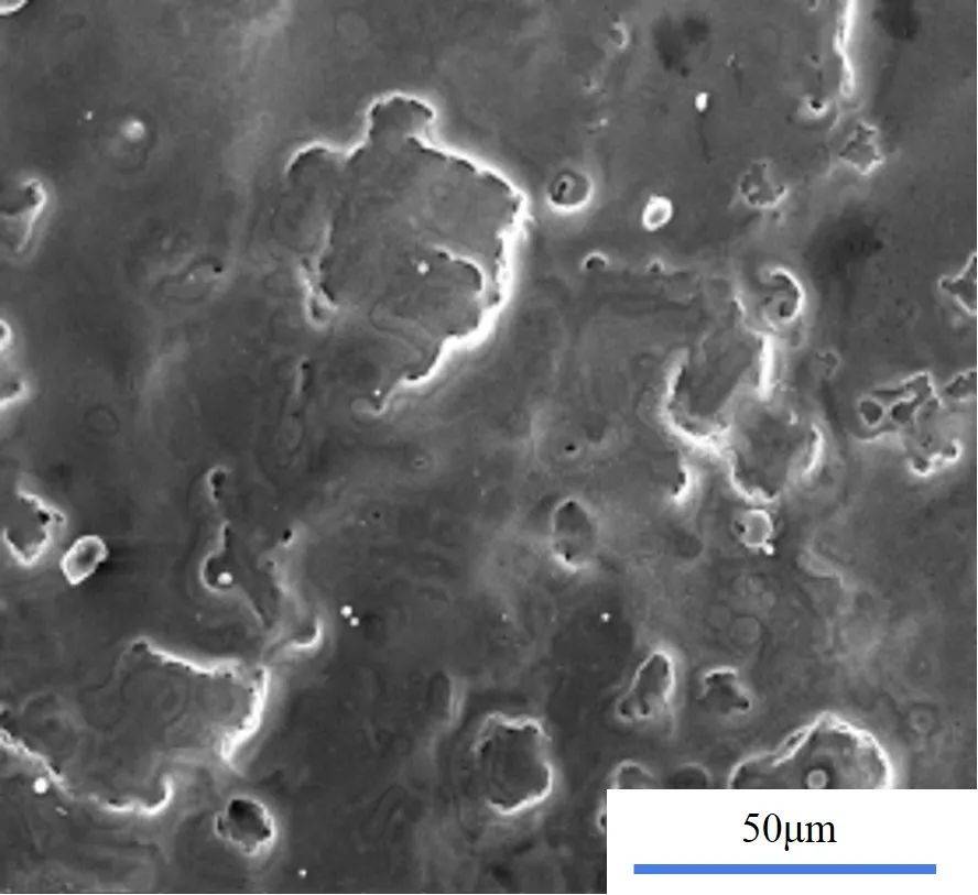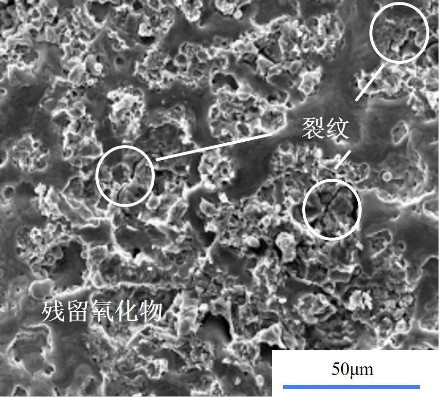 當清洗過程中氧化層厚度較薄時,表面會出現(xiàn)較多裂紋,如圖3所示。這是由于更多的激光能量透過氧化層作用于基體表面,基體的線性膨脹系數(shù)遠大于氧化層,溫度變化引起其發(fā)生較大的熱膨脹,從而使基體和氧化層的界面處存在熱應力,導致氧化層產(chǎn)生較多的裂紋。