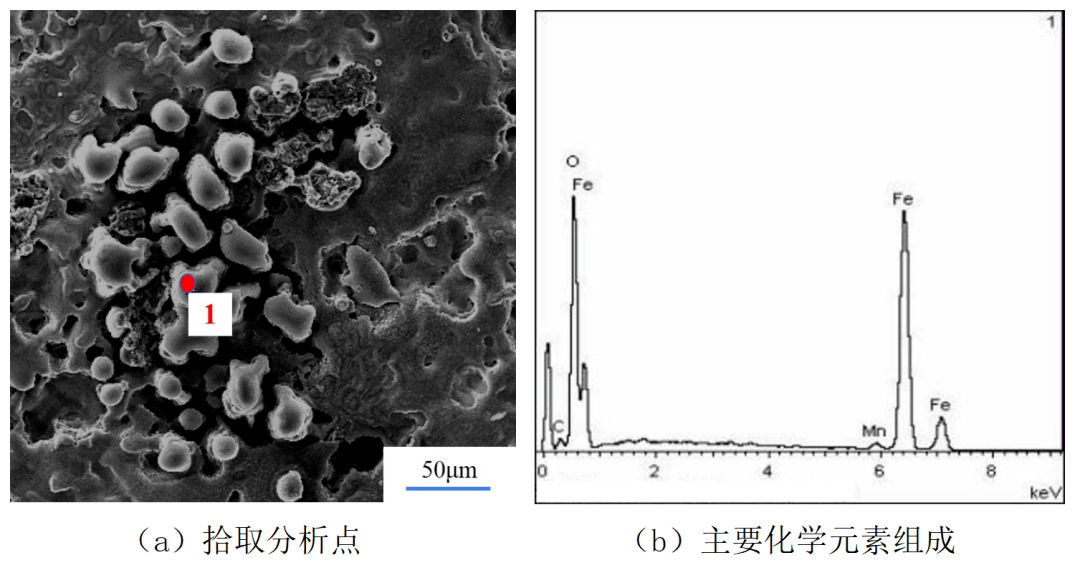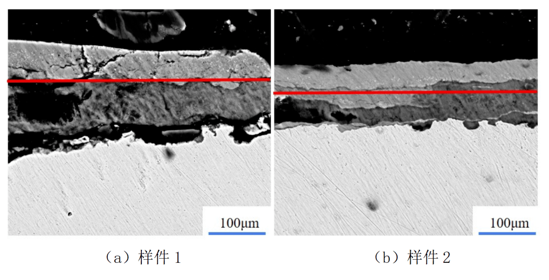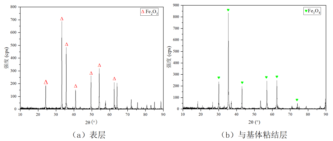 對于測試樣件的剖面方向,如圖6示?;w表層的不同污物成分間存在明顯的界限,即存在兩層不同成分的氧化層。進一步采用X射線衍射儀(XRD)對各層的化合物成分進行測定,存在外銹層和內(nèi)銹層,即外銹層為稀疏的Fe2O3,內(nèi)銹層為Fe3O4與FeO(少量)的混合物,工作狀態(tài)的差異會導致氧化層的致密程度等性質(zhì)有所差異。