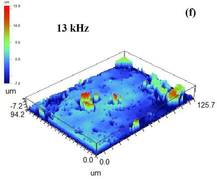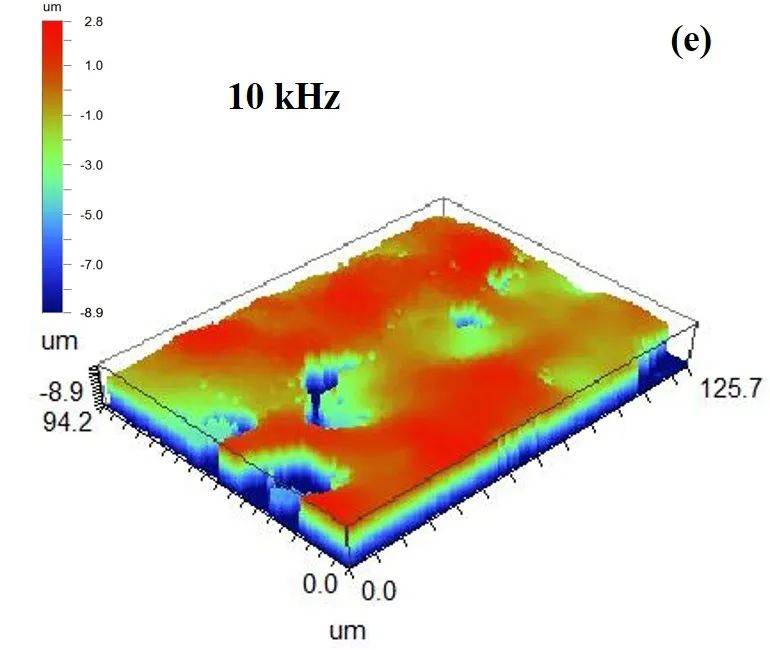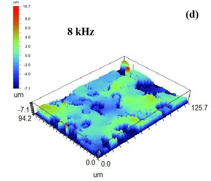 單因素實驗探究了不同激光功率、重復頻率(脈沖寬度)下,激光清洗前后樣件表面粗糙度的變化規(guī)律,如圖9所示。同時,圖10為典型參數(shù)下白光干涉儀測試樣件的3D形貌。