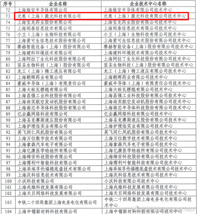喜報(bào):光惠激光入選“上海市企業(yè)技術(shù)中心”名單!