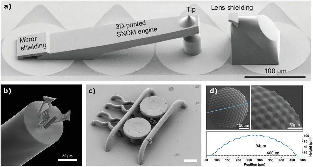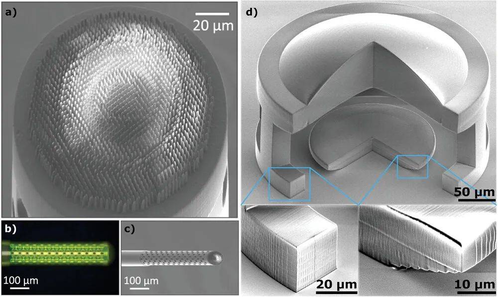 圖5:MPL技術(shù)實(shí)現(xiàn)了復(fù)雜的設(shè)計(jì)能力。a)掃描探針顯微鏡引擎的SEM圖像。來自威利vch。b)夾頭光纖的SEM圖像。來自John Wiley and Sons。c)微諧振器、波導(dǎo)和耦合器的三維量子光學(xué)組件的SEM圖像。來自自然出版社;d)所制備的對數(shù)圖像的形貌,上面的圖像是整體的和放大的SEM圖像,下面的結(jié)果是相對的截面輪廓。來自施普林格·自然。所有結(jié)構(gòu)都將受益于HTA,因?yàn)樗鼈兎謩e增加了光學(xué)透明度和機(jī)械剛性(a),穩(wěn)定性和耐久性(b),精確排列(c),材料均質(zhì)化(d)。
