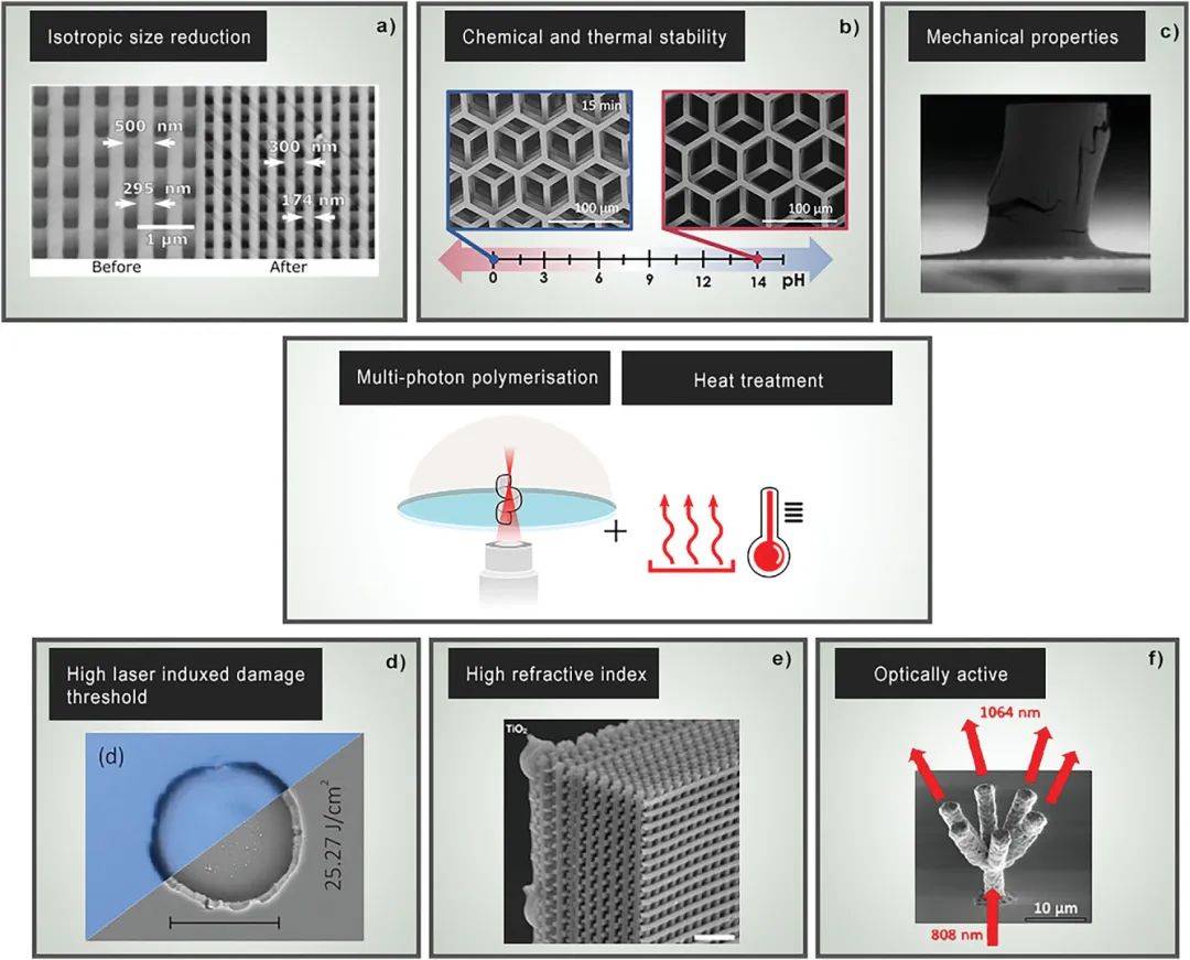 傳統(tǒng)用于多光子光刻的材料是純有機(jī)材料和雜化材料;這類材料提供了很大的靈活性,然而,它們也有一些局限性:光聚合物通常具有低折射率(RI)和柔軟(低楊氏模量)。此外,聚合物更容易受到熱和化學(xué)損傷。煅燒和熱解作為后處理的發(fā)展為解決這些問題提供了機(jī)會(huì),并開發(fā)出比有機(jī)或混合結(jié)構(gòu)性能更好的無機(jī)結(jié)構(gòu)(圖3)。
