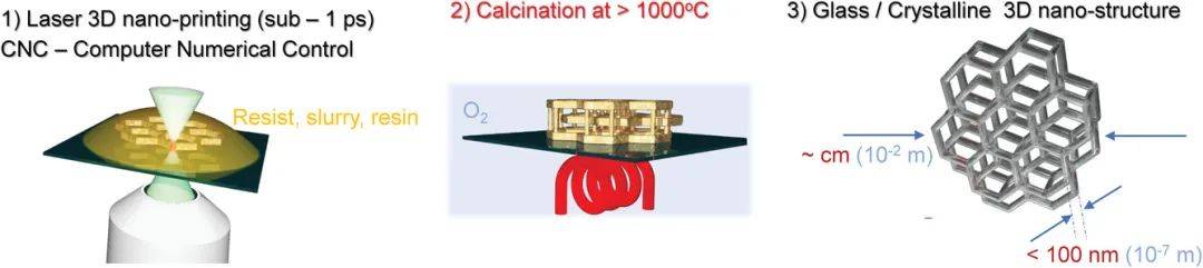 圖1:通過計(jì)算機(jī)數(shù)控(CNC)進(jìn)行3D打印的概念:通過在氧氣中受控的高溫退火,從聚合物到玻璃陶瓷。最終工件的特征尺寸可以達(dá)到納米級≈100納米,宏觀尺寸為≈cm,因此是中尺度的3D結(jié)構(gòu)/打印。
