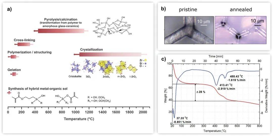 圖2:a) Si-Zr有機(jī)金屬體系從合成到結(jié)晶的熱轉(zhuǎn)變步驟。來自作者G. Merkininkait;b) 3D微支架在1400°C大氣中煅燒前后的光學(xué)圖像。來自英國皇家化學(xué)學(xué)會(huì)。c)熱重分析(TGA)數(shù)據(jù)顯示失重隨溫度的變化。來自MDPI