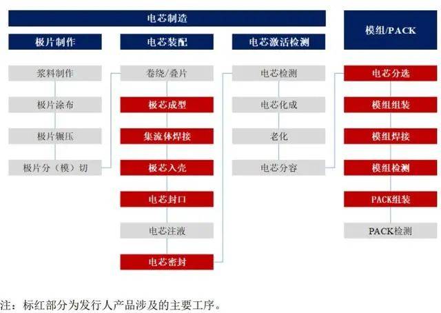 按照應(yīng)用領(lǐng)域劃分,公司主營產(chǎn)品可分為鋰電池制造設(shè)備(以下簡稱“鋰電設(shè)備”)及其他領(lǐng)域制造設(shè)備,其中鋰電設(shè)備收入占比較高。鋰電池的生產(chǎn)可分電芯制造和模組/PACK 兩大環(huán)節(jié),其中電芯制造包含極片制作(前段)、電芯裝配(中段)和電芯激活檢測(后段)三大工序。公司鋰電設(shè)備產(chǎn)品主要用于電芯裝配階段和模組/PACK 階段,具體情況如下: