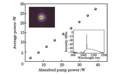 圖 2. 放大的脈沖激光的平均功率隨泵浦功率的變化,插圖是輸出激光的光斑和光譜