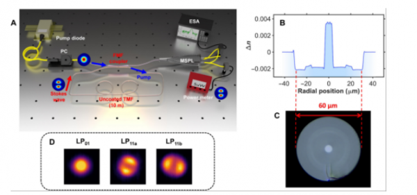 科學(xué)家們使用了一種由純二氧化硅包層和氧化鍺摻雜二氧化硅芯制成的簡化包層雙模光纖。由于聲場擴展到整個包層,減小雙模光纖包層尺寸的過程改善了聲光場之間的重疊,從而增加了受激布里淵散射增益系數(shù)。