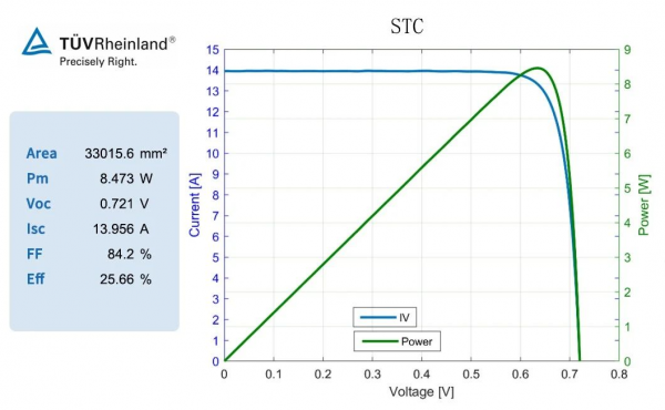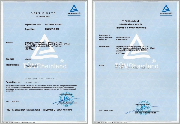 近日,公司的戰(zhàn)略合作客戶普樂科技(POPSOLAR)N型TOPCon電池經(jīng)德國(guó)萊茵TüV集團(tuán)效率測(cè)試認(rèn)證,量產(chǎn)轉(zhuǎn)換效率達(dá)到25.66%,并獲證書。