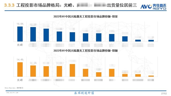 日前,奧維睿沃(AVC Revo)發(fā)布《2023H1中國大陸激光投影市場研究報告》顯示,2023年上半年,激光投影市場(不包含放映機、微投)整體銷量達18.4萬臺,銷額實現(xiàn)47.7億元。細(xì)分領(lǐng)域方面,工程激光、教育激光市場光峰科技(688007.SH)銷量、銷額市場份額均位列第一,專業(yè)顯示激光持續(xù)領(lǐng)跑行業(yè)。