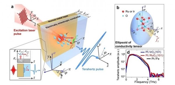 研究人員利用電各向異性,基于導(dǎo)體的異質(zhì)結(jié)構(gòu)開發(fā)了一種用于太赫茲脈沖形成的非相對論機(jī)制。(a)各向異性導(dǎo)體RuO2和IrO2的電導(dǎo)率張量的橢球體。(b)所產(chǎn)生脈沖的特征(c,d)。