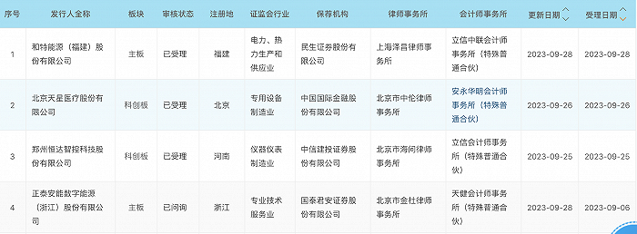 根據(jù)上交所網(wǎng)站,9月28日受理和特能源(福建)股份有限公司,9月26日受理北京天星醫(yī)療股份有限公司,9月25日受理鄭州恒達智控科技股份有限公司(下稱恒達智控),再加上9月6日受理的正泰安能數(shù)字能源(浙江)股份有限公司(下稱正泰安能),上交所9月來合計共受理了上述4家。其中,正泰安能計劃融資額為60億元,恒達智控計劃融資額為25億元。
