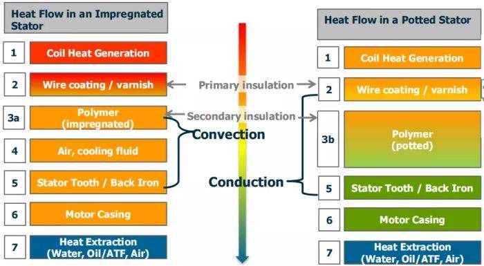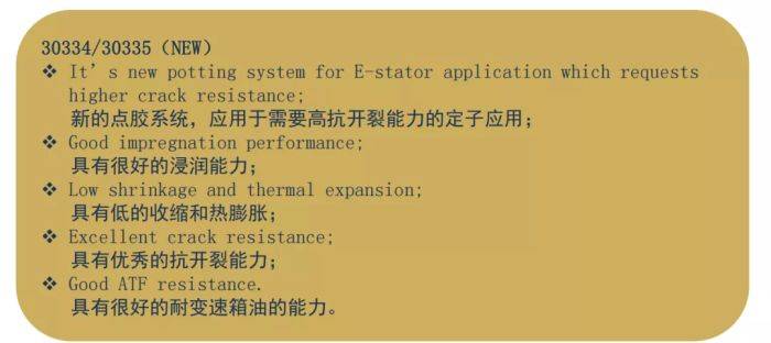所用的灌封樹脂(膠)要求具備特性:1)固化前應(yīng)具有較好的流動(dòng)性,可滲透到繞組表面凹凸不平的縫隙中,灌封后工件外表面應(yīng)光滑平整,使電機(jī)的旋轉(zhuǎn)部分在轉(zhuǎn)動(dòng)時(shí)具有基本相同的轉(zhuǎn)動(dòng)慣量,減小電機(jī)在轉(zhuǎn)速、轉(zhuǎn)向突然變化時(shí)由于機(jī)械應(yīng)力突熱變化引起的振動(dòng),減小冷卻介質(zhì)對(duì)電機(jī)旋轉(zhuǎn)部分產(chǎn)生的阻力。2)對(duì)電機(jī)繞組應(yīng)具有較強(qiáng)的粘接力,并具有較強(qiáng)的耐冷熱沖擊韌性和足夠高的機(jī)械強(qiáng)度。3)應(yīng)具有較高的導(dǎo)熱系數(shù),以減小灌封膠內(nèi)、外表面的溫差,一方面可將電機(jī)繞組運(yùn)行時(shí)產(chǎn)生的熱量快速傳導(dǎo)到工件的外表面。另一方面可減小由于溫差引起的內(nèi)應(yīng)力。4)具有良好的電絕緣性能和酎油性。灌封后電機(jī)定子形成一個(gè)整體,散熱和定子模態(tài)剛度與阻尼性能有所提升,溫升和振動(dòng)噪聲降低,防潮性、抗震性、耐電暈性能有所提升。