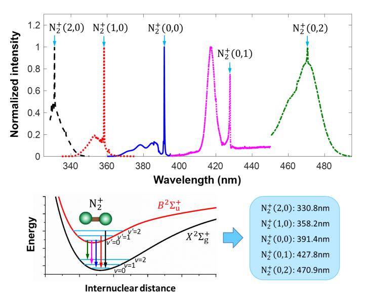 氮?dú)怆x子空氣激光是復(fù)雜光場與分子相干波包多體相互作用的結(jié)果。在該過程中,氮?dú)怆x子的電子態(tài)、 振動態(tài)、轉(zhuǎn)動態(tài)均被相干激發(fā)且不同自由度間相互耦合,不同激發(fā)自由度對氮?dú)怆x子激光增益的貢獻(xiàn)相互交織,核心機(jī)制難以甄別。因此,強(qiáng)場電離誘導(dǎo)的空氣激光現(xiàn)象被報道后,其增益機(jī)制眾說紛紜,莫衷一是。