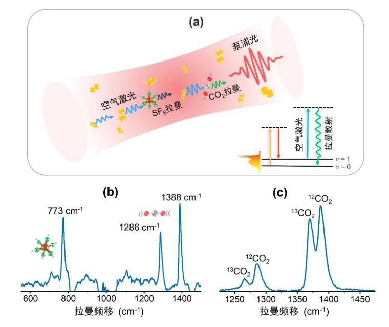 基于空氣激光的多組分大氣分子靈敏檢測的基本原理如圖4(a)所示。當(dāng)一束短脈沖強(qiáng)激光聚焦到空氣中,不僅可以激發(fā)大氣中污染物分子和溫室氣體的相干振動,而且還能夠建立光學(xué)增益產(chǎn)生空氣激光。當(dāng)焦點區(qū)產(chǎn)生的空氣激光遇到相干振動的分子,就會散射出新的波長,產(chǎn)生相干拉曼信號。通過記錄拉曼信號與空氣激光的頻移,即“拉曼指紋”,便可以獲得每種分子特有的“身份”信息。