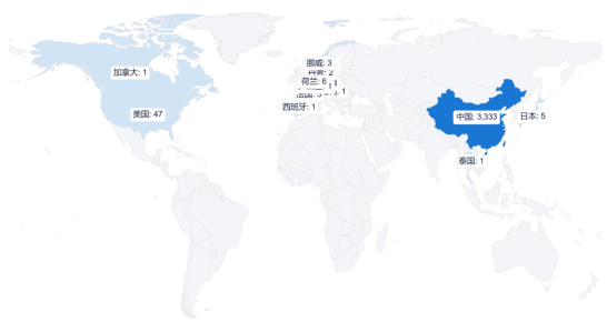 如圖2所示截止檢索日(2023年10月)前,中國3,333;美國47德國44;荷蘭6;日本5;法國3;挪威3;丹麥2;奧地利1;加拿大1;西班牙1;盧森堡1;泰國1。