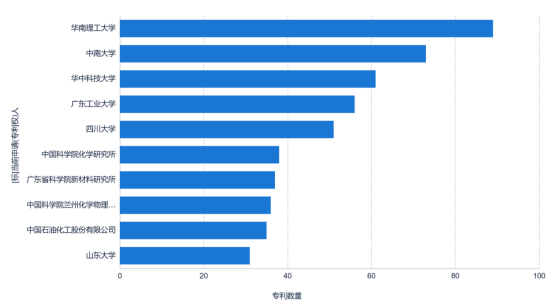 如圖3所示截止檢索日(2023年10月)前,華南理工大學89;中南大學73;華中科技大學61;廣東工業(yè)大學56;四川大學51;中國科學院化學研究所38;廣東省科學院新材料研究所37;中國科學院蘭州化學物理研究所36;中國石油化工股份有限公司35;山東大學31;