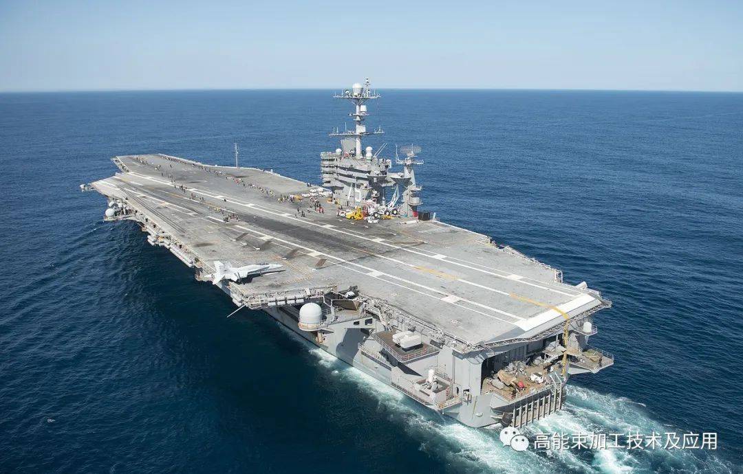 大功率激光-電弧復(fù)合焊接技術(shù)在船舶行業(yè)中有廣泛的應(yīng)用。德國(guó)Meyer船廠建立12kW CO2激光-電弧復(fù)合焊生產(chǎn)線,用于船體平板和加強(qiáng)筋焊接,實(shí)現(xiàn)20m長(zhǎng)的角焊縫一次成形,變形程度減少2/3。GE公司開(kāi)發(fā)光纖激光-電弧復(fù)合焊接系統(tǒng),最大輸出功率20kW,焊接美國(guó)Sara toga號(hào)航空母艦,節(jié)省800噸焊縫金屬,減少80%的工時(shí),如圖3所示。中船725所采用20kW光纖激光器大功率激光-電弧復(fù)合焊接系統(tǒng),可使焊接變形降低60%,焊接效率提高300%。上海外高橋船廠采用16kW光纖激光器大功率激光-電弧復(fù)合焊接系統(tǒng),生產(chǎn)線采用了激光復(fù)合焊+MAG焊的新工藝技術(shù),實(shí)現(xiàn)了4-25mm厚鋼板拼焊單面單道焊雙面成型。大功率激光-電弧復(fù)合焊接技術(shù)在裝甲車輛中有廣泛的應(yīng)用,其焊接特點(diǎn)為:大厚度復(fù)雜金屬結(jié)構(gòu)焊接,成本較低,高效率生產(chǎn)制造。