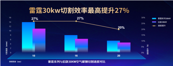 經(jīng)過測試顯示,雷霆30kW在空氣碳鋼切割速度上,比舊款有較大提升。在10mm空氣碳鋼切割上,雷霆30kW可實(shí)現(xiàn)10-11.5m/min的穩(wěn)定加工;在16mm空氣碳鋼切割上,雷霆30kW可實(shí)現(xiàn)6-7m/min的穩(wěn)定加工;切割效率比舊款最高提升27%。在切割質(zhì)量上,雷霆30kW可實(shí)現(xiàn)切割面光滑無掛渣、無毛刺的效果。