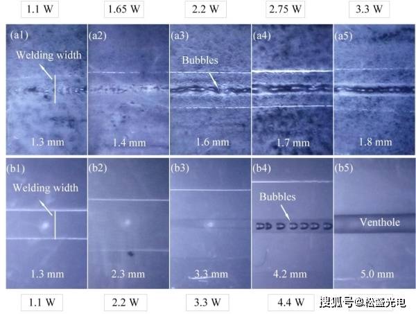 上圖中,兩組樣品的融化區(qū)都隨著輸入功率的增大而加寬。注意到,部分樣品的焊縫中心出現(xiàn)了氣泡。氣泡對(duì)焊接件的氣密性有消極的影響,理想的焊接結(jié)果應(yīng)是形成與母材無異的、無氣泡或雜質(zhì)的焊縫。然而,與碳黑焊接的樣品因局部(碳黑絮團(tuán))吸收能量相對(duì)較大,在較低輸入功率(2.2W)時(shí)就已經(jīng)出現(xiàn)因熱分解而產(chǎn)生的氣泡,但無吸收劑焊接的樣品因無高吸收率的碳黑,在線能量較高(4.4W)時(shí)才出現(xiàn)氣泡,表明在相同線能量下,采用2μm激光焊接的透明PET樣品更不易出現(xiàn)氣孔缺陷。