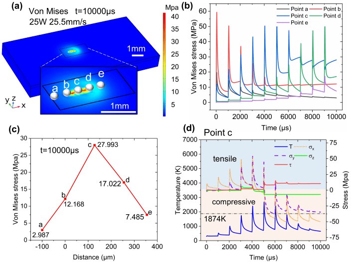 圖2激光掃描路徑的應力分布。(a)a-e點的Von Mises應力分布示意圖;(b)a-e點Von Mises應力的時間分布;(c) a-e點在10000 μs時的Von Mises應力;(d) c點溫度及不同應力分布,藍色區(qū)域為拉應力區(qū),橙色區(qū)域為壓應力區(qū)。