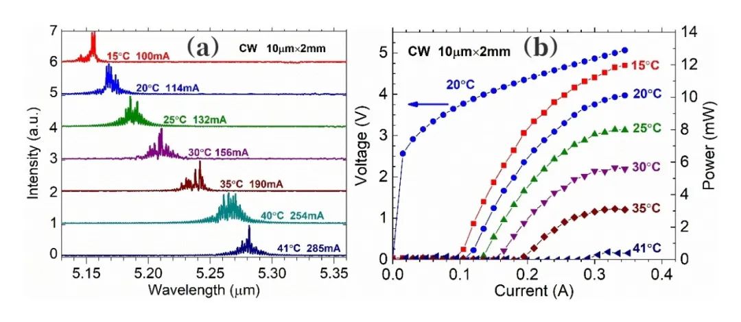 (a)5.2μm波長、2mm腔長、10μm脊寬的器件在15℃-41℃之間連續(xù)激射光譜;