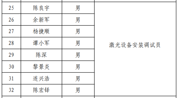 根據(jù)12月5日深圳市人力資源和社會(huì)保障局公布的“2023年深圳技能大賽獲獎(jiǎng)名單”,該局對(duì)優(yōu)勝選手及在參賽辦賽中作出突出貢獻(xiàn)的單位名單予以公布。在本次大賽認(rèn)定的244名“深圳市技術(shù)能手”中,被認(rèn)定為“深圳市技術(shù)能手”的激光設(shè)備安裝調(diào)試員共有8人,名單如下: