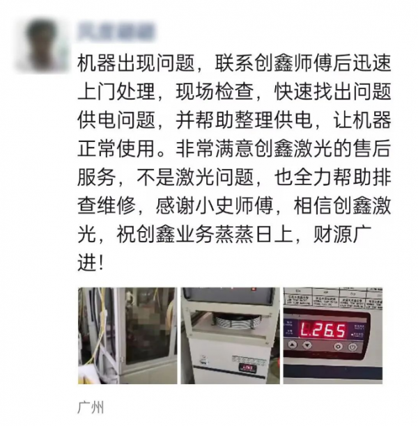 11月16日,創(chuàng)鑫售后服務(wù)部門接到廣州花都做金屬配件的終端用戶報修需求,反饋激光設(shè)備有不出光現(xiàn)象,機(jī)器停止運(yùn)行,佛山辦事處售后工程師史工與用戶溝通后約定17日前往終端用戶工廠進(jìn)行現(xiàn)場檢測。