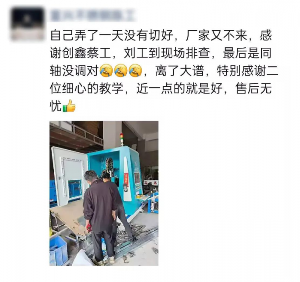 除了在用戶提出服務(wù)需求提供幫助,創(chuàng)鑫激光“金保姆”售后服務(wù)團(tuán)隊還會不定時回訪終端用戶,幫助用戶勘察設(shè)備環(huán)境是否需要改進(jìn),配套設(shè)施及參數(shù)是否正常等,團(tuán)隊成員也在持續(xù)不斷的提升自身專業(yè)技能,力求用更專業(yè)的技術(shù)、更及時的服務(wù)以及更認(rèn)真的態(tài)度,為所有客戶及用戶提供最優(yōu)質(zhì)的服務(wù)!